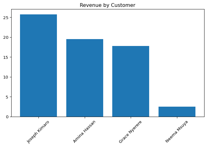 query ='''SELECT c.full_name, SUM(oi.quantity * oi.unit_price) AS revenueFROM customers cJOIN orders o ON c.customer_id = o.customer_idJOIN order_items oi ON o.order_id = oi.order_idGROUP BY c.full_nameORDER BY revenue DESC;'''df = pd.read_sql(query, con)print(df)